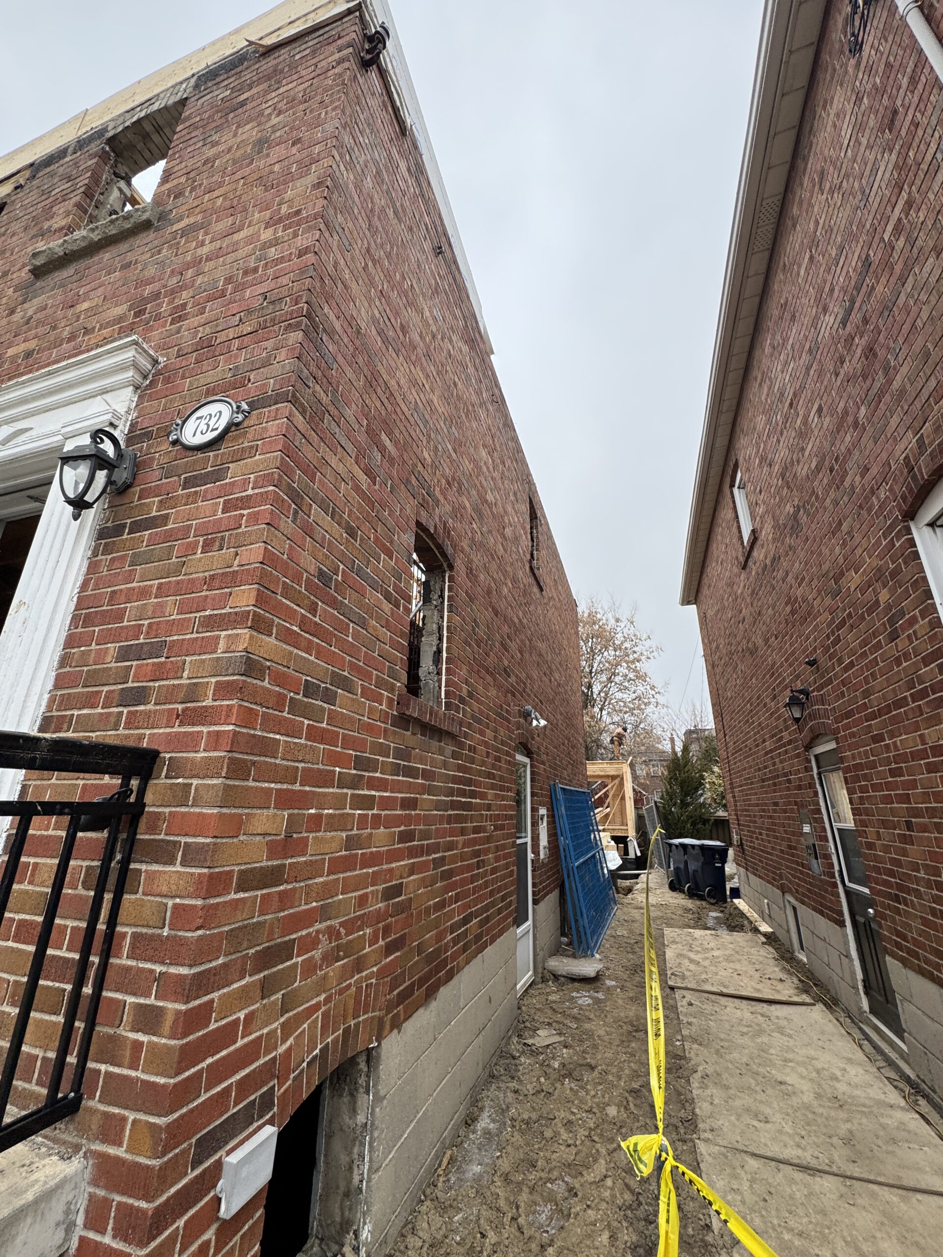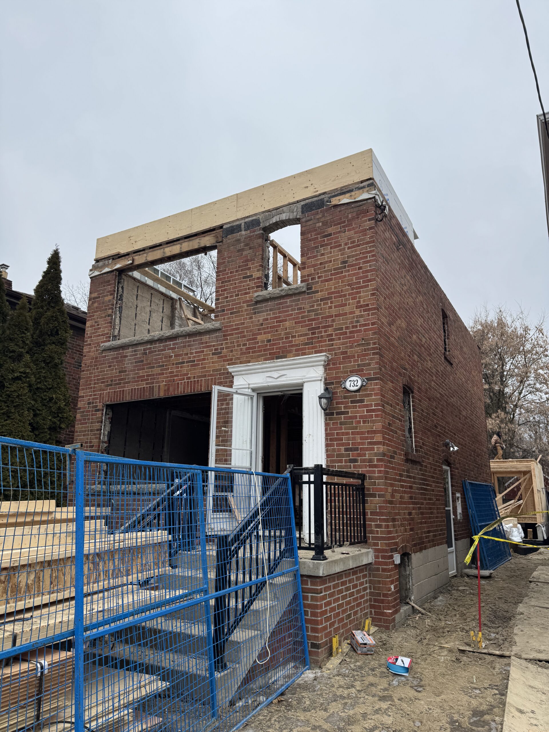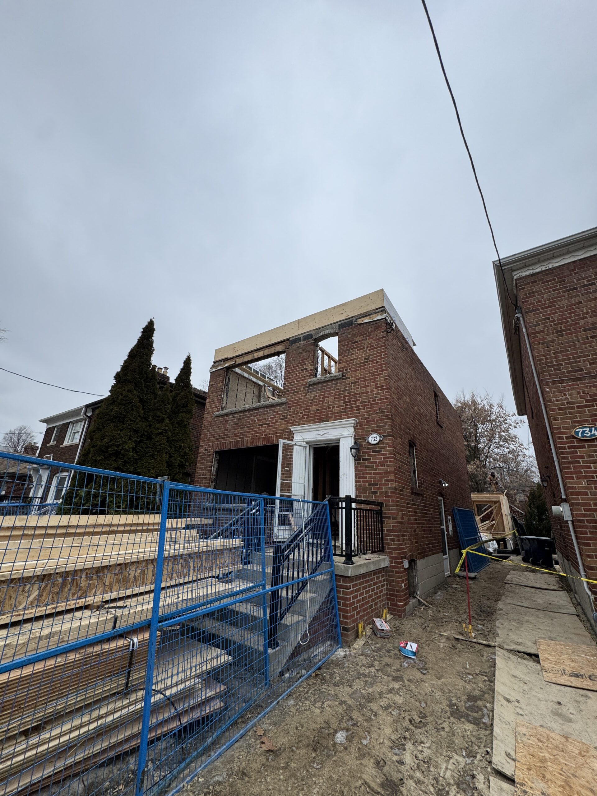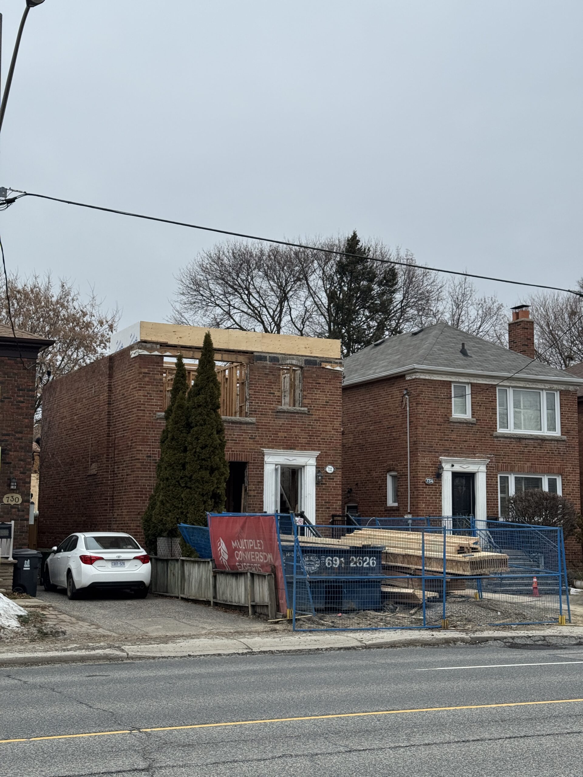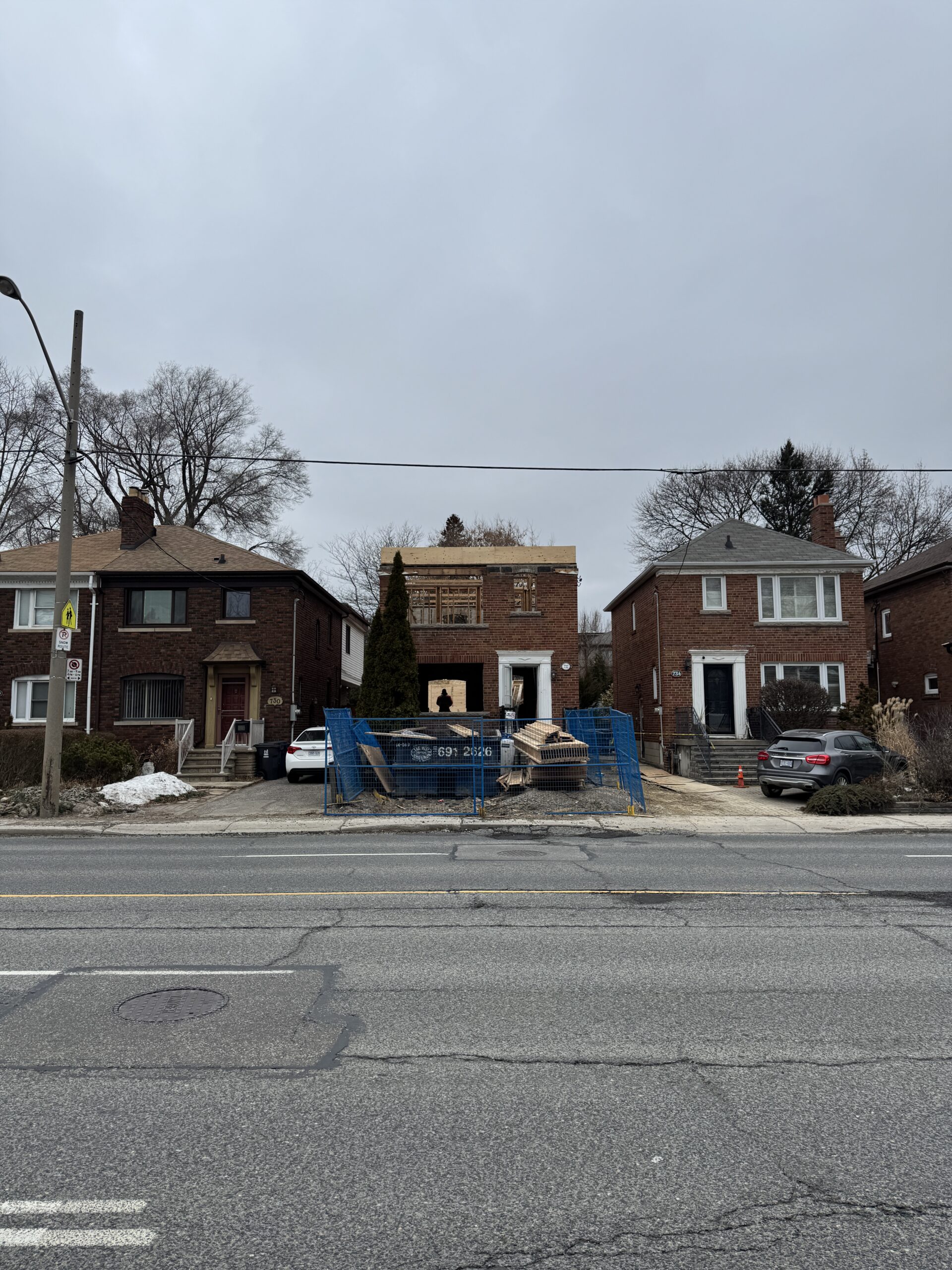 This single-family home in East York is being converted in to a 4+1 top-up and extension with a garden suite. The location of this site, being on a busy main road, poses unique challenges during the construction process. Sites like these are much more difficult for deliveries of material and equipment.